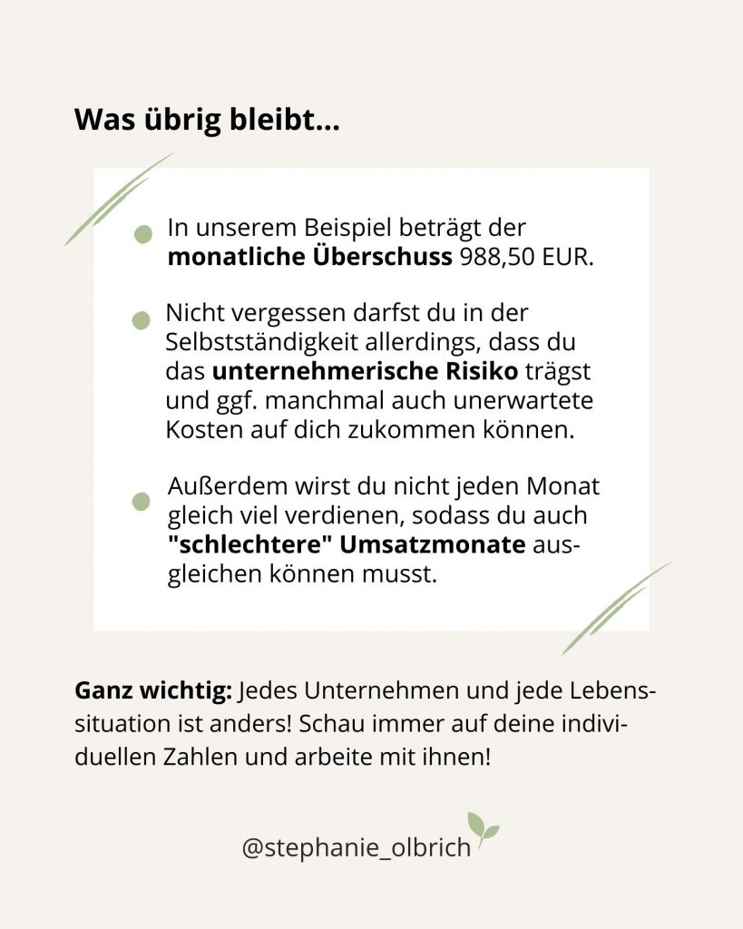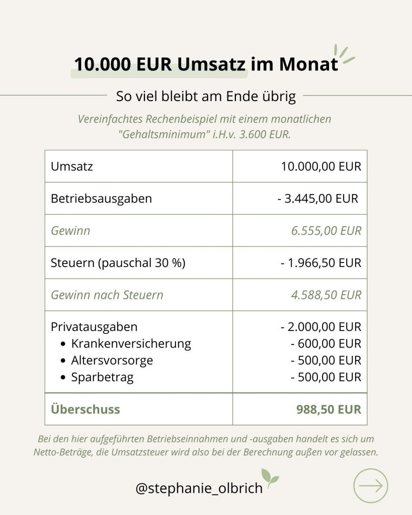 Außerdem wirst du nicht jeden Monat gleich viel verdienen, sodass du auch „schlechte“ Umsatzmonate ausgleichen können musst.