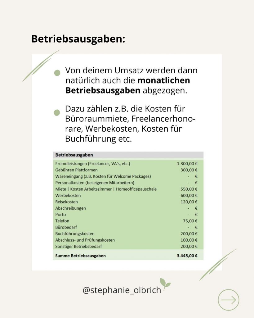 Von deinem Umsatz werden die monatlichen Betriebsausgaben abgezogen. Dazu zählen z.B. Kosten für deine Büroraummiete, Honorare für Freelancer, Werbekosten, Kosten für deine Buchführung oder Kosten für Plattformen wie Elopage und Thrivecard etc. In unserem Rechenbeispiel gehen wir von monatlichen Betriebsausgaben i.H.v. 3.445 Euro aus.