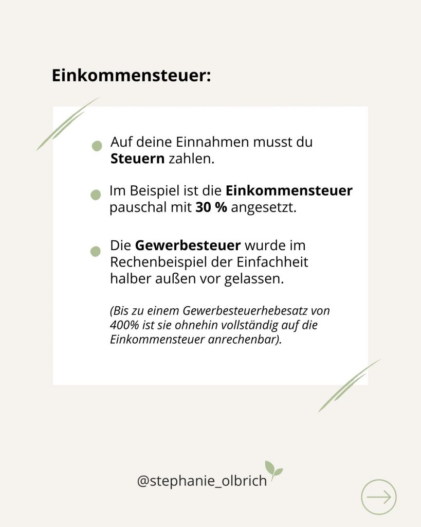 Auf deine Einnahmen musst du Steuern zahlen. In unserem Beispiel haben wir die Einkommensteuer pauschal mit 30 % angesetzt. Somit kommen wir auf einen Betrag i.H.v. 1.966,50 Euro.